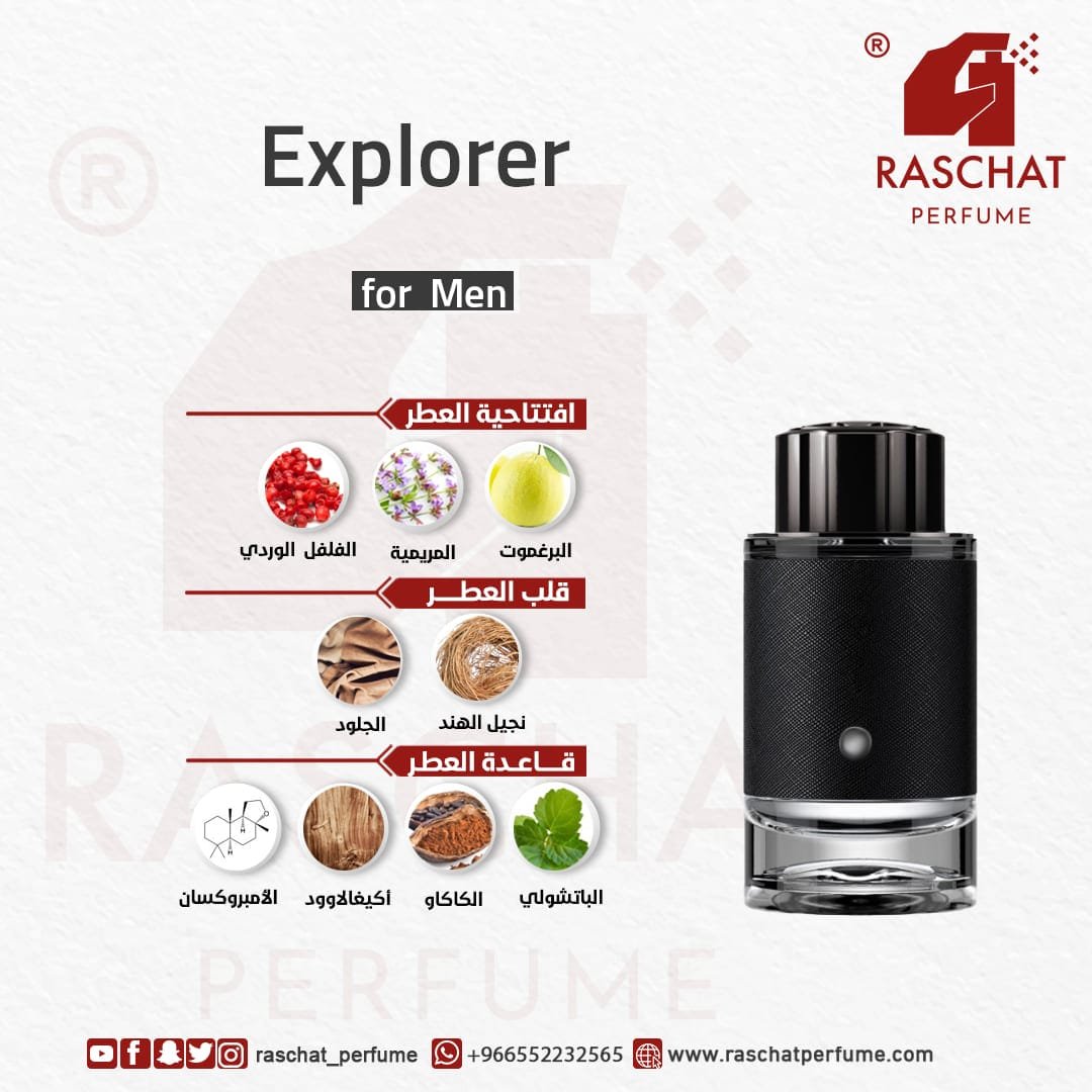 اسم العطر، Explorer (المستكشف)، مستوحى من روح المغامرة التي تميز الرجل الذي يحب السفر واستكشاف العالم. يتميز هذا العطر بأنه يعكس شخصية الرجل الواثق من نفسه الذي لا يخشى التحديات، بل يسعى إلى تجربة كل ما هو جديد ومثير. كل مكون في هذا العطر يحمل قصة من منطقة مختلفة من العالم، مما يجعله بمثابة رحلة حسية عبر القارات.